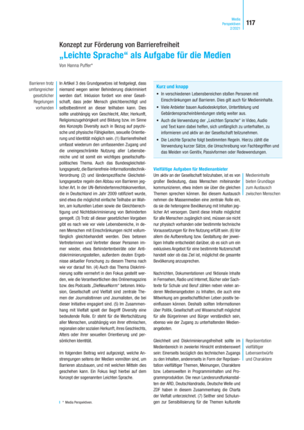 "In verschiedenen Lebensbereichen stoßen Personen mit Einschränkungen auf Barrieren. Dies gilt auch für Medieninhalte. Viele Anbieter bauen Audiodeskription, Untertitelung und Gebärdenspracheinblendungen stetig weiter aus. Auch die Verwendung der „Leichten Sprache“ in Video, Audio und Text kann dabei helfen, sich umfänglich zu unterhalten, zu informieren und aktiv an der Gesellschaft teilzunehmen. Die Leichte Sprache folgt bestimmten Regeln. Hierzu zählt die Verwendung kurzer Sätze, die Umschreibung von Fachbegriffen und das Meiden von Genitiv, Passivformen oder Redewendungen." (Kurz und knapp, Seite 117)