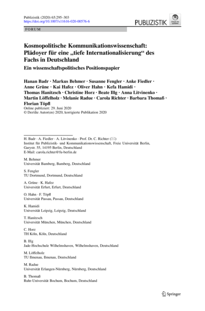 "Wir appellieren an alle in Deutschland tätigen Kommunikationswissenschaftler* innen, also an unsere Scientific community, und besonders an unsere Fachgesellschaft DGPuK, ihre Verantwortung im Bereich der Internationalisierung zu überdenken und den Prozess der „tiefen Internationalisierung“ in Forschung, Lehre und Hochschulstrukturen voranzutreiben. Diese Neuorientierung ist nicht nur wissenschaftlich relevant, um die Unterrepräsentation weiter Teile der Welt und innerhalb westlicher Gesellschaften als Desiderata zu beschreiben und bestehende Forschungslücken zu schließen. Sie ist auch gesellschaftlich relevant und wird für die Zukunft von allergrößter Bedeutung sein. Die Erforschung der Welt muss heraus aus der Nische des akademischen Spezialistentums und ins Zentrum wissenschaftlichen Arbeitens gerückt werden. Die Globalisierung der Wissenschaft ist kein abgeschlossener Prozess, sondern eine Jahrhundertaufgabe, zu deren Bewältigung wir alle zur Mitwirkung aufrufen. Die Erforschung von nicht-westlichen Ländern sollte nicht nur in Krisenzeiten als relevant wahrgenommen werden. Insgesamt ist daher nicht nur eine verbesserte strukturelle Absicherung der internationalen Kommunikationswissenschaft an deutschen Hochschulen erforderlich, sondern auch eine Sensibilisierung des Fachs und der deutschen Wissenschaftsgemeinschaft, von der Fachgesellschaft DGPuK bis zu den Herausgeber*innen von in Deutschland erscheinenden Fachzeitschriften und den Verleger*innen von Fachverlagen. Das Fach kann und muss in puncto Internationalisierung besser werden. Und dies nicht nur in quantitativer Hinsicht (durch Konferenzteilnahmen und mehr Publikationen), sondern auch durch die Wertschätzung der globalen Vielfalt inhaltlicher Problemstellungen und intellektueller Denkrichtungen – über die USA und andere englischsprachige Länder hinaus. Die internationale Kommunikationsforschung sollte mehr als nur ein Nebenschauplatz der Kommunikationswissenschaft sein, denn nur so vermag sie, zentrale Annahmen über Medien und Kommunikationsprozesse, die wir seit langem für selbstverständlich gehalten haben, in Frage zu stellen." (Fazit und Ausblick, Seite 302)