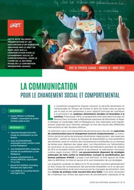 "La malnutrition résulte en partie de pratiques alimentaires inappropriées : des repas peu diversifiés souvent en raison du manque de disponibilité ou d’accessibilité d’aliments variés et nutritifs, des connaissances insuffisantes ou un manque de temps pour élaborer des repas sains. Des approches innovantes de communication pour le changement social et comportemental (CCSC) se développent depuis plusieurs années pour permettre non seulement de comprendre et retenir les comportements promus en matière de nutrition, mais aussi d’encourager et de motiver leur adoption. Celles-ci s’appuient également de plus en plus sur les sciences comportementales et sur la place de l’émotion comme moteur au changement de comportement. Quelles sont les méthodes et les activités permettant de favoriser les interactions et de tester les comportements promus lors des séances de sensibilisation ? Comment mobiliser toutes les personnes concernées et notamment intéresser les hommes aux sujets de nutrition/santé ? Quelles sont les atouts des médias de masse et des technologies de l’information et de la communication (TIC) ? Cette note apporte quelques éclairages sur ces questions à travers des retours d’expériences à Madagascar, au Burkina Faso, au Niger, au Mexique, et au Malawi, qui ont été partagés au cours d’un webinaire." (https://gret.org)