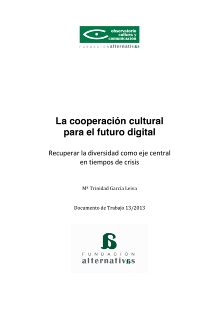 "Este trabajo analiza el estado de situación de la cooperación española, en el contexto de la evolución de la agenda internacional de desarrollo, para preguntarse por su impacto e implicaciones futuras en el ámbito de la cultura. Se trata de detectar los desafíos que tiene la cooperación cultural para concretarse en un entorno digital, además de y más allá de la crisis. Dado que se aspira a superar la mirada simplemente nacional, se incluyen las visiones y opiniones de un grupo de expertos y dirigentes oficiales iberoamericanos. Un balance crítico permite afirmar que la cooperación oficial en general, y en materia de cultura en particular, no parecen ser prioridad para el Gobierno. De hecho, se las está sometiendo a una reorientación política y económica, basada en una drástica reducción presupuestaria y una estrategia desdibujada, que ignora el camino transitado. Se concluye que la cooperación cultural debe repensarse para reubicarse en un escenario mayoritariamente digital pero orientándose, al mismo tiempo, hacia el objetivo de la promoción y protección de la diversidad cultural." (Página 4)