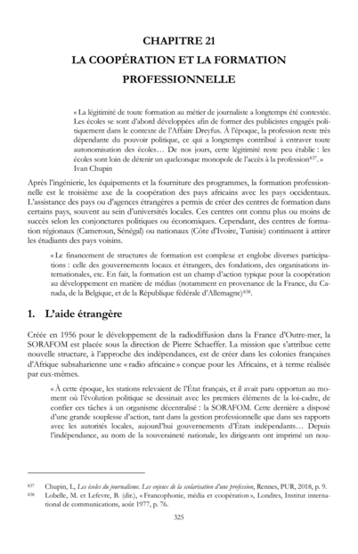 "Après l’ingénierie, les équipements et la fourniture des programmes, la formation professionnelle est le troisième axe de la coopération des pays africains avec les pays occidentaux. L’assistance des pays ou d’agences étrangères a permis de créer des centres de formation dans certains pays, souvent au sein d’universités locales. Ces centres ont connu plus ou moins de succès selon les conjonctures politiques ou économiques. Cependant, des centres de formation régionaux (Cameroun, Sénégal) ou nationaux (Côte d’Ivoire, Tunisie) continuent à attirer les étudiants des pays voisins. « Le financement de structures de formation est complexe et englobe diverses participations: celle des gouvernements locaux et étrangers, des fondations, des organisations internationales, etc. En fait, la formation est un champ d’action typique pour la coopération au développement en matière de médias (notamment en provenance de la France, du Canada, de la Belgique, et de la République fédérale d’Allemagne).» (Page 325)