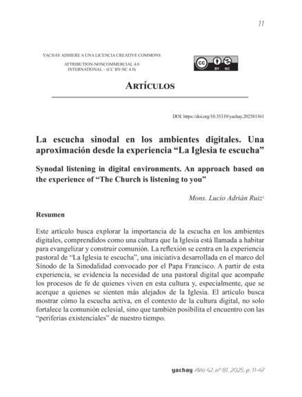 "Este artículo busca explorar la importancia de la escucha en los ambientes digitales, comprendidos como una cultura que la Iglesia está llamada a habitar para evangelizar y construir comunión. La reflexión se centra en la experiencia pastoral de “La Iglesia te escucha”, una iniciativa desarrollada en el marco del Sínodo de la Sinodalidad convocado por el Papa Francisco. A partir de esta experiencia, se evidencia la necesidad de una pastoral digital que acompañe los procesos de fe de quienes viven en esta cultura y, especialmente, que se acerque a quienes se sienten más alejados de la Iglesia. El artículo busca mostrar cómo la escucha activa, en el contexto de la cultura digital, no solo fortalece la comunión eclesial, sino que también posibilita el encuentro con las “periferias existenciales” de nuestro tiempo." (Resumen)