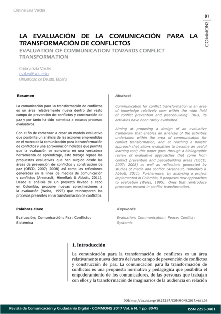 "La comunicación para la transformación de conflictos es un área relativamente nueva dentro del vasto campo de prevención de conflictos y construcción de paz y por tanto ha sido sometida a escasos procesos evaluativos. Con el fin de comenzar a crear un modelo evaluativo que posibilite un análisis de las acciones emprendidas en el marco de la comunicación para la transformación de conflictos y una aproximación holística que permita que la evaluación se convierta en una verdadera herramienta de aprendizaje, este trabajo repasa las propuestas evaluativas que han surgido desde las áreas de prevención de conflictos y construcción de paz así como las reflexiones generadas en la línea de medios de comunicación y conflictos. Desde el análisis de un proyecto llevado a cabo en Colombia, propone nuevas aproximaciones a la evaluación que reincorporen los procesos presentes en la transformación de conflictos." (Resumen)