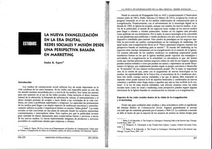 "Evangelización efectiva en el nuevo panorama religioso, por lotanto, requiere una reorientación de los programas de Iglesia y mensajes con el status quo de la gente para obtener respuesta positiva. Ello precisa un sistemático estudio de las necesidades, deseos, percepciones, preferencias asi corno la satisfacción de las necesidades de la gente siendo apuntado para la evangelización y alimento espiritual. La naturaleza dinámica de la vida humana y el ambiente hace necesario que la Iglesia personalice sus productos especificos o servicios a las tendencias actuales, patrones de pensamiento y necesidades "empaquetando" el mensaje en un lenguaje modemo-global de los medios digitales mientras permanece fiel a su doctrina." (Conclusión)