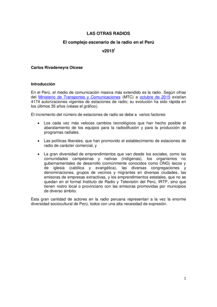 "En el Perú, el medio de comunicación masiva más extendido es la radio. Según cifras del Ministerio de Transportes y Comunicaciones (MTC) a octubre de 2015 existían 4174 autorizaciones vigentes de estaciones de radio; su evolución ha sido rápida en los últimos 35 años [...] La inmensa mayoría de estaciones de radio en nuestro país corresponden a empresas privadas de diversas y complejas características, algunas grandes empresas y conglomerados y otras medianas, pequeñas y hasta micro empresas de carácter familiar. Una pequeña parte, menor a la décima porción, son estaciones de radio con autorizaciones de tipo educativo [...] Una de las características de las otras radios, es que no cuentan con una definición clara y sintética, debido a que sus objetivos van más allá de ser empresas comerciales, [...] sino estamos frente a un gran, diverso y complejo grupo de experiencias radiales con características multiformes." (Página 1-3)