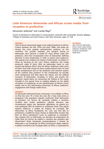 "Latin American telenovelas began to be widely broadcast on African screens between the late 1970s and early 1980s, and today are among the most popular entertainment products on the continent. The content, aesthetic and narrative format of telenovelas have become a model for many African video film producers, who have incorporated some of telenovelas’ defining elements in their productions in order to attract local audiences. This special issue analyses the impact of telenovelas’ circulation in Africa by focusing on the ‘uses’ African audiences and media producers make of them. Why do telenovelas travel so well around sub-Saharan Africa? How do African audiences make sense of them? And what impact do these media products have on local media entrepreneurs and on the aesthetics and narrative aspects of the contents they produce? In this introduction we provide some background and data about the history and the political economy of telenovelas’ circulation in Africa, and answer the questions raised above by connecting the finding of the essays included in the special issue to ongoing debates on the global circulation of melodrama, on the transformation of African screen media, and on the performative dimension of African audiences’ engagement with foreign media forms." (Abstract)