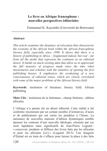 French Studies in Southern Africa, volume 44, issue 2 (2014), pp. 120-143
