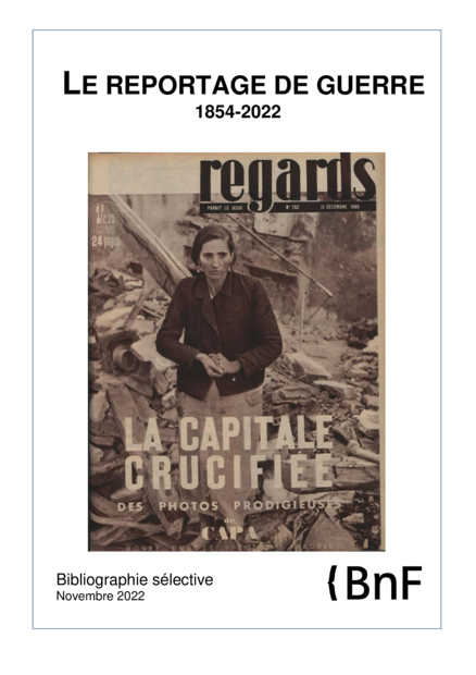 "Le reportage de guerre est une pratique journalistique qui nous est à la fois familière et mal connue. Familière par la présence au quotidien de ce type de reportage dans les médias ; mal connue en ce qui concerne les conditions de fabrication de ces reportages, autour desquelles s’est développée la figure du correspondant de guerre aventurier « n’écoutant que son courage et cette étrange passion de reporter », comme l’écrit le journal Ce soir à propos de sa reportère-photographe officielle en Espagne durant la guerre civile, Gerda Taro, morte sur le terrain en 1937. Cette bibliographie se propose d’éclairer « l’envers du décor » du reportage de guerre à travers une sélection de documents disponibles pour la plupart en salle B de la bibliothèque tous publics." (Abstract)