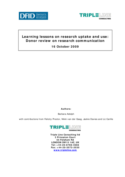 "The main findings of the review are: 1. General consensus on the importance of research communication among the donors interviewed, and wide interest in developing appropriate programmes and mechanisms. 2. Little evidence of a strategic approach within individual agencies, with research communication generally dispersed within the organisation. 3. Emphasis continues to be on the supply side of research, with a weak understanding of and capacity to support the demand side of research communication. 4. Many examples of good practice and of innovative initiatives, also related to engaging users and other stakeholders in the research communication process. 5. Several donors are placing a priority on being a learning organisation, with research communication contributing to internal knowledge management. 6. No comprehensive Monitoring and Evaluation systems in place to assess the effectiveness and relevance of various research communication approaches, and to feed this information back into research communication policy and investment decisions. 7. Most donors maintain their own web portals / archives of research findings. 8. There is a strong interest among donors to explore and expand open access to funded research findings. 9. Most donors would welcome strengthening networking and linkages between donors interested in research communication to improve efficiency and effectiveness, for shared learning and for greater impact. 10. DFID is recognized and valued as one of the leaders in the field of research communication." (Summary)