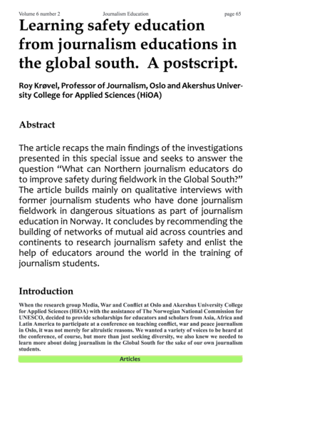 "The article recaps the main findings of the investigations presented in this special issue and seeks to answer the question “What can Northern journalism educators do to improve safety during fieldwork in the Global South?” The article builds mainly on qualitative interviews with former journalism students who have done journalism fieldwork in dangerous situations as part of journalism education in Norway. It concludes by recommending the building of networks of mutual aid across countries and continents to research journalism safety and enlist the help of educators around the world in the training of journalism students." (Abstract)