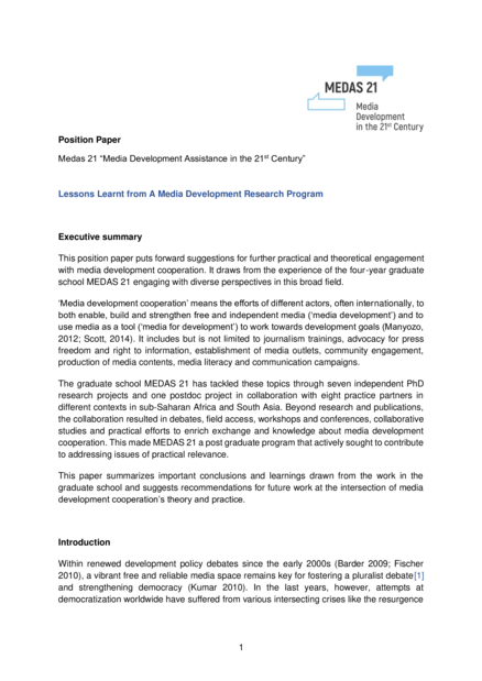 "1. It is of utmost importance to provide wider access to data sources on the sector, many of which are still confidential. This is particularly the case for baseline studies and ex-post evaluations of projects. The sector's learning process is hampered by limited access to data and contact persons [...] 2. In order to broaden the perspective, it is necessary to put an emphasis on learning from on-site actors. “Local ownership”, “trust”, or “participation”, for instance, are popular terms that hardly anyone involved in international media development cooperation projects would be opposed to [...] 3. It is also a priority to make failures much more visible and to be able to share not only successes, as a good principle of learning method. This makes it possible not only to react to rectify them but also to value them and act creatively [...] 4. While the online and offline lived realities can no longer be separated, research has to increasingly take into account digital spaces and practices as well as their interaction with offline spaces and practices (Schmidt-Lux & Wohlrab-Sahr 2020). Media development cooperation research, through its cornerstone "the impact assessment“, is trapped in the quantitative-qualitative methods debate [...] 5. More broadly, theoretical perspectives should also be renewed with critical and plural approaches: Who is theorizing media development cooperation, how and for what? The legacy of colonial hierarchies, and continuing postcolonial tensions are not only a topic in practical media development cooperation and in the collaboration between partners from different countries." (Lessons learnt and recommendations, page 9-10)