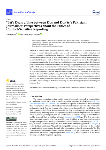"In conflict-ridden countries, the news media has a pivotal role to perform as an active advocate of human rights and societal peace, as well as a facilitator of conflict mitigation and resolution through the gathering and dissemination of non-partisan information. While today the world witness armed conflicts in more forms than ever before, some countries are more sensitive to conflict and violence—such as Pakistan. The country is recognized as one of the riskiest places for working journalists by virtue of recurrent political, ethnic, and religious conflicts. The Pakistani journalists work in a climate of fear and risks and with opposing groups seeking to influence the news media, which creates more difficulties for them to report unbiased and accurate news to the public. The practice of ethics has become more challenging for the Pakistani journalists because the country lacks an effective and standardized code of conduct to report on conflict. Therefore, drawing on the theory of the conflict triangle by Galtung, this study seeks the Pakistani journalists’ perspectives about the ethics of conflict sensitive reporting. In doing so, this study uses the quantitative method of survey and the qualitative method of in-depth interviews. The study uses descriptive analysis to present the survey findings in the form of percentage and thematic analysis to present the findings of interview data." (Abstract)