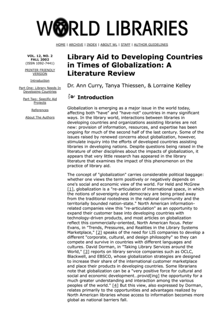 "A useful review of the literature pertaining to library aid and globalization, including book donation/distribution programmes, and support for local publishers. The study focuses on two questions: what are the major needs of libraries in the developing countries? And whether some of those needs are, or are not, being met. Despite anecdotal evidence gathered by the authors during visits to developing countries, that globalization has affected the type of library aid now needed, no research could be found to substantiate this. It is the contention of the authors, however, that lessons learned from the existing research about more traditional “book aid” remain very relevant to library aid relationships affected by globalization, and that these lessons should be used as the basis for further research that incorporates this new phenomenon of internationalization. “Clearly, in order to develop effective programs that make a difference within the new global economy and information world, further research on the challenges and opportunities of library aid is needed." (Hans M. Zell, Publishing, Books & Reading in Sub-Saharan Africa, 3d ed. 2008, nr. 1380)