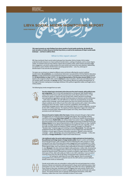 "This report presents our main findings from eleven months of social media monitoring. We identify the main narratives of online discourse and their key drivers, as well as the weaknesses of Libya’s social media landscape — and how to address them." (Summary)