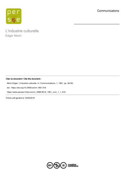 "Industrie culturelle — Industrialisation de l'esprit — Ce qui était création tend à devenir production — En tête de l'industrialisation de l'esprit, les mass media — Le problème de la diffusion suit celui de la production — Atteindre un maximum d'auditeurs, spectateurs, lecteurs — Syncrétisme, standardisation, cosmopolitisme en fonction d'un public « moyen »." (Jean-Marie Van Bol, Abdelfattah Fakhfakh: The use of mass media in the developing countries. Brussels: CIDESA, 1971 Nr. 1531, topic code 00)