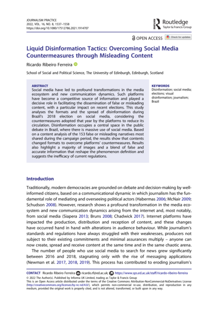 "Social media have led to profound transformations in the media ecosystem and new communication dynamics. Such platforms have become a competitive source of information and played a decisive role in facilitating the dissemination of false or misleading content, with a particular impact on recent elections. This study analyses the formats and the spread of disinformation during Brazil’s 2018 election on social media, considering the countermeasures adopted that year by the platforms to reduce its circulation. Disinformation occupies a central space in the public debate in Brazil, where there is massive use of social media. Based on a content analysis of the 153 false or misleading narratives most shared during the campaign period, the results show that contents changed formats to overcome platforms’ countermeasures. Results also highlight a majority of images and a blend of false and accurate information that reshape the phenomenon definition and suggests the inefficacy of current regulations." (Abstract)