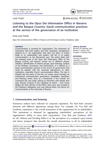 "Communication is essential for organisations. The interaction of institutions with their publics and their reputation management depend on it. ‘An organisation that does not listen, or listens badly to its stakeholders and publics, will fail in its public communication,’ as Jim Macnamara says. This article deals with the listening work of the Opus Dei Information Office of the Basque Country and Navarra carried out in different phases: initiation, identification of interest groups, open listening, analysis of the findings, conclusions and transmission. It is offered as a good communication practice at the service of government that could be applied, with the necessary adjustments, to other institutions, especially Church communication offices. The text is divided into two parts: in the first, we review some concepts on institutional communication, governance, intangibles, reputation and listening, which serve as a framework; in the second, we summarise the case study, relying on interviews with people who were directly involved in the unfolding of events – Juan Carlos Mújika, the then director of the Office; Jesús Juan, who worked in the Prelature’s delegation; and Juan Manuel Mora, Vice Rector for Communication at the University of Navarra." (Abstract)