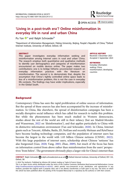 "This paper investigates everyday information seeking and misinformation among Internet users in rural and urban China. The research employs both quantitative and qualitative methods to identify user demographics and categories of misinformation encountered on mobile devices online. The paper makes two contributions: one is to bridge hitherto unconnected research on everyday information practices with the literature on misinformation. The second is to demonstrate that, despite the assumption that China’s tightly controlled online space leads to less of a misinformation problem, this is not the case in everyday life contexts. The findings may have wider implications, especially in the Global South." (Abstract)