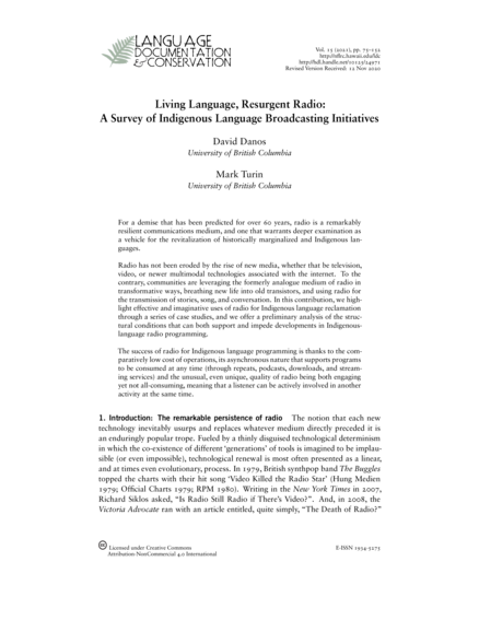 "For a demise that has been predicted for over 60 years, radio is a remarkably resilient communications medium, and one that warrants deeper examination as a vehicle for the revitalization of historically marginalized and Indigenous languages. Radio has not been eroded by the rise of new media, whether that be television, video, or newer multimodal technologies associated with the internet. To the contrary, communities are leveraging the formerly analogue medium of radio in transformative ways, breathing new life into old transistors, and using radio for the transmission of stories, song, and conversation. In this contribution, we highlight effective and imaginative uses of radio for Indigenous language reclamation through a series of case studies, and we offer a preliminary analysis of the structural conditions that can both support and impede developments in Indigenouslanguage radio programming. The success of radio for Indigenous language programming is thanks to the comparatively low cost of operations, its asynchronous nature that supports programs to be consumed at any time (through repeats, podcasts, downloads, and streaming services) and the unusual, even unique, quality of radio being both engaging yet not all-consuming, meaning that a listener can be actively involved in another activity at the same time." (Abstract)