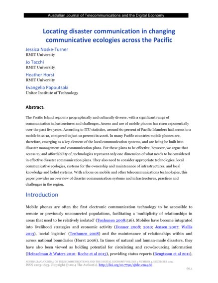 "According to ITU statistics, around 60 percent of Pacific Islanders had access to a mobile in 2012, compared to just 10 percent in 2006. In many Pacific countries mobile phones are, therefore, emerging as a key element of the local communication systems, and are being be built into disaster management and communication plans. For these plans to be effective, however, we argue that access to, and affordability of, technologies represent only one dimension of what needs to be considered in effective disaster communication plans. They also need to consider appropriate technologies, local communicative ecologies, systems for the ownership and maintenance of infrastructures, and local knowledge and belief systems. With a focus on mobile and other telecommunications technologies, this paper provides an overview of disaster communication systems and infrastructures, practices and challenges in the region." (Abstract)