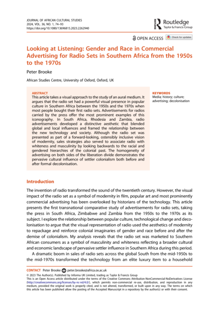 "This article takes a visual approach to the study of an auralmedium. It argues that the radio set had a powerful visual presence in popular culture in Southern Africa between the 1950s and the 1970s when most people bought their first radio sets. Advertisements for radios carried by the press offer the most prominent examples of this iconography. In South Africa, Rhodesia and Zambia, radio advertisements developed a distinctive aesthetic that blended global and local influences and framed the relationship between the new technology and society. Although the radio set was presented as part of a forward-looking, ostensibly inclusive vision of modernity, sales strategies also served to associate radio with whiteness and masculinity by looking backwards to the racial and gendered hierarchies of the colonial past. The homogeneity of advertising on both sides of the liberation divide demonstrates the pervasive cultural influence of settler colonialism both before and after formal decolonisation." (Abstract)