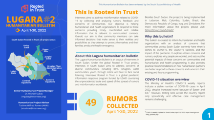 "The Lugara Humanitarian Bulletin is an output of Internews in South Sudan. Under the global Rooted in Trust project, Internews in South Sudan aims to address concerns of diverse communities, including IDPs, refugees, cattle communities, youth, through online and face to face social listening." (Page 1)