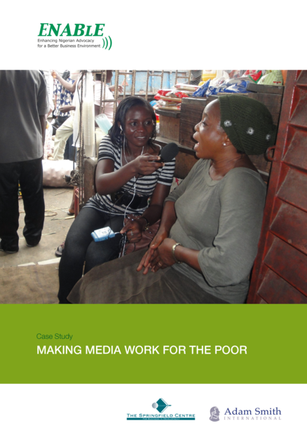 "The Nigerian media focuses little on business, and the business coverage that does exist is often dominated by macro-economic, large and international business issues, or is one-sided, representing only the views of government or the elite. The real issues that impact on Nigeria’s millions of small businesses and its huge agricultural sector are often neglected, and the poor are denied an effective voice on business environment issues [...] ENABLE [the Enhancing Nigerian Advocacy for a Better Business Environment program] [...] recognis[es] media as a key driver of change and working to reinforce the incentives and improve the skills around small business and agricultural reporting. This involves developing the media as a major actor in the business environment policy process, and working with them to increase the quality and quantity of sustainable (commercially viable) coverage of small business and agricultural issues. The underlying premise for sustainability in media is simple: media coverage that focuses on the real issues that impact on how the majority of Nigerian’s make their living, and which does this in a dynamic and relevant way, will gain significant audience. These popular media products will then attract advertisers and sponsorship. In other words, effective programmes that focus on the livelihoods of the poor can be both popular and profitable for media houses." (Executive summary)