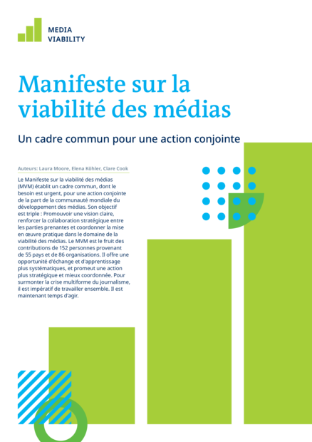 "Le Manifeste sur la viabilité des médias (MVM) établit un cadre commun, dont le besoin est urgent, pour une action conjointe de la part de la communauté mondiale du développement des médias. Son objectif est triple : Promouvoir une vision claire, renforcer la collaboration stratégique entre les parties prenantes et coordonner la mise en oeuvre pratique dans le domaine de la viabilité des médias. Le MVM est le fruit des contributions de 152 personnes provenant de 55 pays et de 86 organisations. Il offre une opportunité d'échange et d'apprentissage plus systématiques, et promeut une action plus stratégique et mieux coordonnée. Pour surmonter la crise multiforme du journalisme, il est impératif de travailler ensemble." (Page 1)