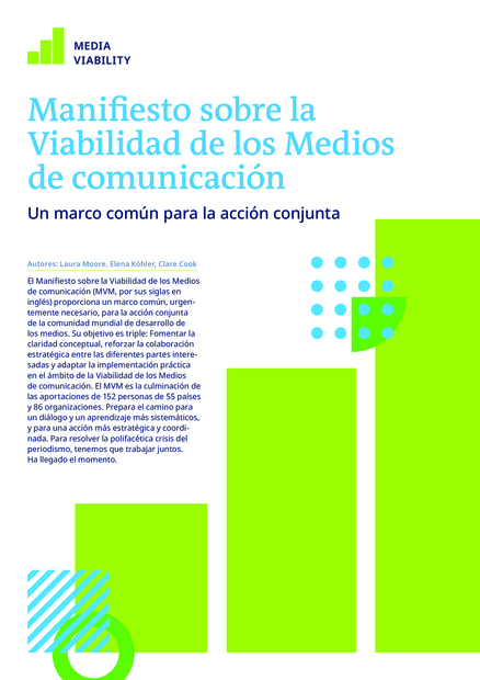 "El Manifiesto sobre la Viabilidad de los Medios de comunicación (MVM, por sus siglas en inglés) proporciona un marco común, urgentemente necesario, para la acción conjunta de la comunidad mundial de desarrollo de los medios. Su objetivo es triple: fomentar la claridad conceptual, reforzar la colaboración estratégica entre las diferentes partes interesadas y adaptar la implementación práctica en el ámbito de la Viabilidad de los Medios de comunicación. El MVM es la culminación de las aportaciones de 152 personas de 55 países y 86 organizaciones. Prepara el camino para un diálogo y un aprendizaje más sistemáticos, y para una acción más estratégica y coordinada. Para resolver la polifacética crisis del periodismo, tenemos que trabajar juntos.o solve the multi-faceted journalism crisis, we need to work together." (Página 1)