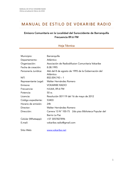 "El manual de estilo facilita el cumplimiento de los Objetivos, Misión y Visión de la Emisora, teniendo en cuenta los principios y políticas sobre los que se sustenta el hacer de la Emisora Comunitaria Vokaribe Radio. Éste busca dinamizar y guiar las prácticas que componen la apuesta global de avanzar en el ejercicio del derecho a la comunicación, a la información y libertad de expresión, como base de la democratización de la comunicación. El manual de estilo de Vokaribe Radio ubica estas guias prácticas a nivel de la localidad y se concreta a través del accionar de la Emisora Comunitaria, lo cual significa ofrecerle a los diversos públicos, colectivos y grupos organizados, comunidades y personas, los mecanismos de participación que les posibiliten expresarse a través de los espacios existentes en Vokaribe Radio." (Página 2)