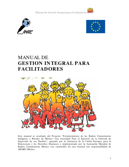 "El Manual de Gestión para Facilitadores es el resultado de la sistematización de una serie de talleres impartidos al equipo de Gestión y Formación de AMARC México y a la red de radios. Estos textos recogen la mirada del Programa de Gestión de AMARC ALC pero también los aportes e impresiones de quienes participaron en esos talleres. No se trata de un manual exhaustivo, sino de un texto que recoge e integra diferentes miradas, conocimientos y experiencias para construir una guía de trabajo para los facilitadores que emprendan la compleja tarea de trabajar la gestión en las radios comunitarias de México. Este manual también es tan sólo un acercamiento para retomar las mejores prácticas, un punto de partida de un momento específico, ya que creemos que aún faltan muchos temas por discutir y definir como red de radio comunitarias al respecto." (Introducción)