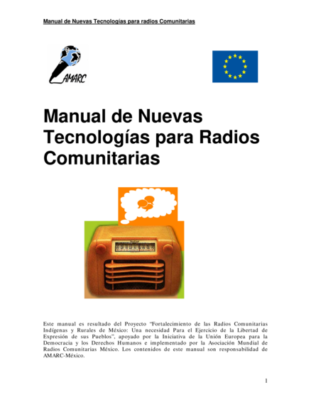 "El presente manual sobre Nuevas Tecnologías para Radios Comunitarias tiene el objetivo de facilitar un material de referencia para el quehacer radiofónico. Si bien los temas de nuevas tecnologías son tan amplios como complejos, este manual sólo se refiere a los temas relacionados estrictamente con las radios comunitarias y sus necesidades de uso de estas tecnologías, sin abarcar los tópicos de convergencia tecnológica en materia de radiodifusión. Lo que aquí se presenta está basado en conversaciones, testimonios, experiencias propias, sistematizaciones de talleres y capacitaciones que se dieron en la red entre el 2006 y 2007, y recoge particularmente ideas que, en su gran mayoría, son ya puestas en práctica de distintas maneras y en distintos niveles por las radios comunitarias." (Introducción)