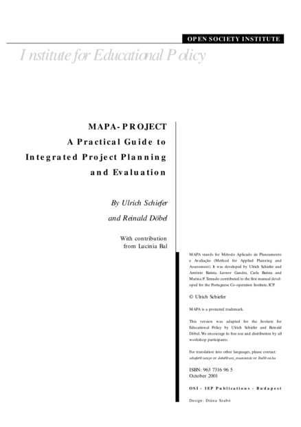"MAPA stands for Método Aplicado de Planeamento e Avaliação (Method for Applied Planning and Assessment). It was developed by Ulrich Schiefer and António Batista. Leonor Gandra, Carla Batista and Marina P. Temudo contributed to the first manual developed for the Portuguese Co-operation Institute, ICP" (Page 1)