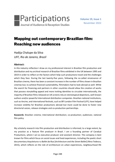 "In this industry reflection I draw on my professional interest in Brazilian film production an distribution and my archival research of Brazilian films exhibited in the UK between 1995 and 2019 in order to reflect on the factors which help such productions travel and the challenges which they face. During the last twenty-five years, following the so-called renaissance of Brazilian cinema, there has been a constant increase in the number of films shown in Brazilian cinemas but, to achieve financial sustainability, filmmakers had to look abroad as well. While the search for financing and partners in other countries should allow the creation of works that possess storytelling appeal and more inviting identities to circulate internationally, the majority of Brazilian films released on UK screens rely on stereotypical depictions, well-known authors and/or powerful international distribution companies. Brazilian national institutions, such as Ancine, and international festivals, such as BFI London Film Festival (LFF), have helped increase visibility for Brazilian productions abroad but more could be done to foster new directorial voices, release strategies and coproduction partnerships." (Abstract)