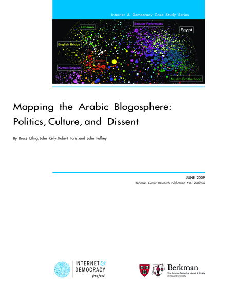 "This study explores the structure and content of the Arabic blogosphere using link analysis, term frequency analysis, and human coding of individual blogs. We identified a base network of approximately 35,000 active Arabic language blogs (about half as many as we found in a previous study of the Persian blogosphere), discovered several thousand Arabic blogs with mixed use of Arabic, English and French, created a network map of the 6,000 most connected blogs, and with a team of Arabic speakers hand coded over 4,000 blogs. The goal for the study was to produce a baseline assessment of the networked public sphere in the Arab Middle East, and its relationship to a range of emergent issues, including politics, media, religion, culture, and international affairs. We found: a Country-Based Network: We found that the Arabic blogosphere is organized primarily around countries [...] Who are Arabic Bloggers? Demographic coding indicates that Arabic bloggers are predominately young and male. The highest proportion of female bloggers is found in the Egyptian youth sub-cluster, while the Maghreb/French Bridge and Syrian clusters have the highest concentration of males. Personal Life and Local Issues are Most Important: Overall, the writing of most bloggers is centered on personal, diary-style observations. Those that write about politics tend to focus on issues within their own country and are more often than not critical of domestic political leaders." (Key findings, page 3-4)