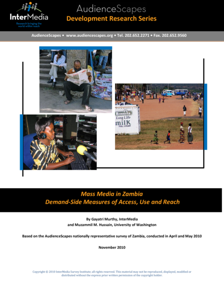 "The data presented in this report are based on a survey conducted in April and May 2010 among Zambian adults age 15 and above. Using the 2000 Zambian National Census as the sampling frame and a stratified random sampling design, a nationally representative probability sample of 2,000 respondents was selected [...] This report is divided into three sections: Chapter 1 - Mass Media Access and Use: Common determinants of access (such as regional distribution, income, and available infrastructure); key issues in Zambians' media use habits, particularly use differences between designated "opinion leaders" and the general population. Chapter 2 - Barriers to Media Access and Use: Profiles of those Zambians lacking access to various mass media; analysis of obstacles to access. Chapter 3 - Media Outlet Preferences in Radio and Television: Audience and programming profiles of specific media outlets." (Page 5)