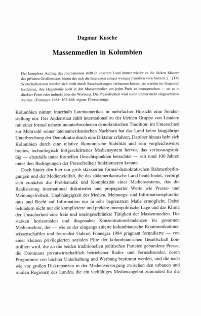"Die vorangegangenen Ausführungen über die historische Entwicklung und aktuelle Situation der kolumbianischen Massenmedien haben deutlich gemacht, daß die Konzentration sowohl des Presse- als auch des Hörfunk- und Fernsehsektors in den Händen einer kleinen Gruppe politisch und ökonomisch einflußreicher Familien eines der gravierendsten Probleme des Medienbereichs darstellt. Die Massenmedien sind heute in erster Linie privatwirtschaftlich organisierte Unternehmen, deren Eigentümer im wesentlichen die zwei Ziele anstreben, möglichst hohe Einnahmen aus dem Mediengeschäft zu erzielen und/oder politischen Einfluß zu üben. W ährend bei der Presse aufgrund ihrer historisch begründeten Bindung zu einer der beiden traditionellen Parteien verstärkt die letztgenannte Zielsetzung zutage tritt, läßt sich im Hörfunkund Fernsehsektor ein zunehmender Einfluß mächtiger Wirtschaftsgruppierungen feststellen. Das aktuelle Massenmediensystem in Kolumbien wird zunehmend von großen Medienkonzernen beherrscht, deren Einfluß sich nicht nur auf horizontaler Ebene auf eine Vielzahl verschiedener Medien erstreckt, sondern die auch mit dem Finanz- und Industriesektor engste Verflechtungen aufweisen." (Seite 610)