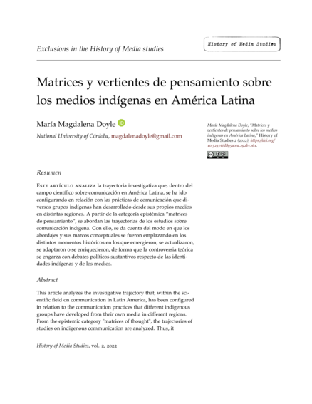 "Este artículo analiza la trayectoria investigativa que, dentro del campo científico sobre comunicación en América Latina, se ha ido configurando en relación con las prácticas de comunicación que diversos grupos indígenas han desarrollado desde sus propios medios en distintas regiones. A partir de la categoría epistémica "matrices de pensamiento", se abordan las trayectorias de los estudios sobre comunicación indígena. Con ello, se da cuenta del modo en que los abordajes y sus marcos conceptuales se fueron emplazando en los distintos momentos históricos en los que emergieron, se actualizaron, se adaptaron o se enriquecieron, de forma que la controversia teórica se engarza con debates políticos sustantivos respecto de las identidades indígenas y de los medios." (Resumen)