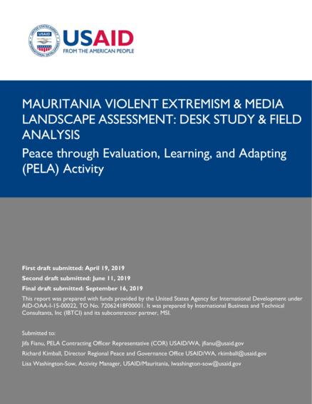 "The primary questions driving this assessment are: What are the principal drivers of extremism in Mauritania? What are the principal social fractures that have been, or could be, exploited by extremists? The table below displays the overall main drivers of VE in Mauritania, as well as the five subnational assessment sites (Nouakchott, Nouadhibou, Trarza, Hodh el-Gharbi, and Assaba). Poor governance and relative deprivation are among the most pervasive push factors identified in this assessment, while ideology and social media are the main pull factors [...] The second main assessment question is: What is the role of the Mauritania media landscape within the context of VE? Section 4 addresses this question through a thorough assessment of the overall media landscape in Mauritania. We found that the Mauritanian media has the potential to be a key actor in efforts to counter VE in Mauritania. However, it needs a lot of capacity building and professionalization in order to be effective." (Pages 8-10)