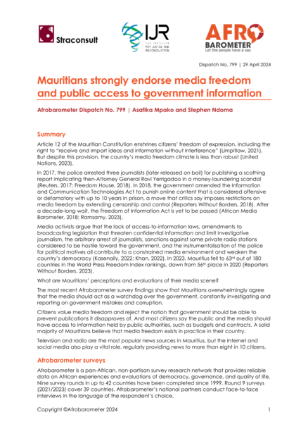 "Mauritians take a strong stand on freedom of information: Overwhelming majorities value the media’s role as a watchdog on government, think the media should be free of government interference, and demand public access to information held by the government, such as budgets and contracts. A majority – but not all – also believe that their media is in fact “somewhat” or “completely” free. While television and radio are king among news sources in Mauritius, the Internet and social media also play a vital role, providing news to more than eight in 10 citizens on a regular basis." (Conclusion)