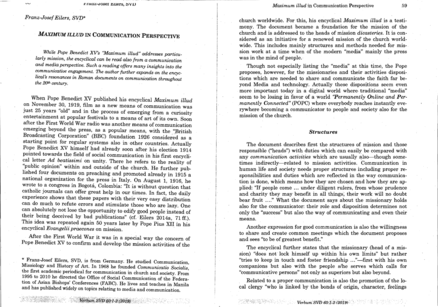 "While Pope Benedict XV's "Maximum illud" addresses particularly mission, the encyclical can be read also from a communication and media perspective. Such a reading offers many insights into the communicative engagement. The author further expands on the enyclical's resonances in Roman documents on communication throughout the 20th century." (Abstract)