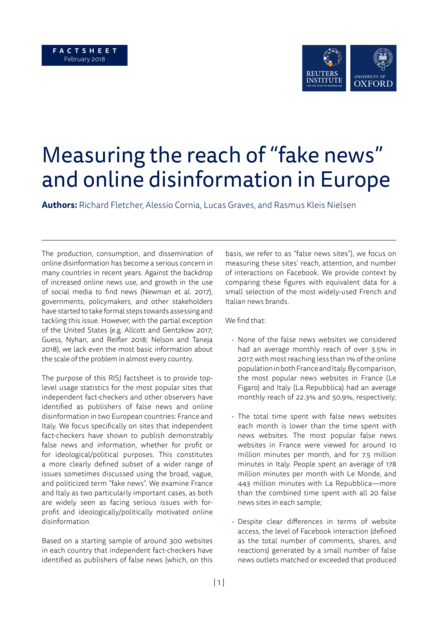 "The purpose of this RISJ factsheet is to provide toplevel usage statistics for the most popular sites that independent fact-checkers and other observers have identified as publishers of false news and online disinformation in two European countries: France and Italy. We focus specifically on sites that independent fact-checkers have shown to publish demonstrably false news and information, whether for profit or for ideological/political purposes. This constitutes a more clearly defined subset of a wider range of issues sometimes discussed using the broad, vague, and politicized term “fake news”. We examine France and Italy as two particularly important cases, as both are widely seen as facing serious issues with forprofit and ideologically/politically motivated online disinformation. Based on a starting sample of around 300 websites in each country that independent fact-checkers have identified as publishers of false news (which, on this basis, we refer to as “false news sites”), we focus on measuring these sites’ reach, attention, and number of interactions on Facebook. We provide context by comparing these figures with equivalent data for a small selection of the most widely-used French and Italian news brands. We find that: • None of the false news websites we considered had an average monthly reach of over 3.5% in 2017, with most reaching less than 1% of the online population in both France and Italy. By comparison, the most popular news websites in France (Le Figaro) and Italy (La Repubblica) had an average monthly reach of 22.3% and 50.9%, respectively; • The total time spent with false news websites each month is lower than the time spent with news websites. The most popular false news websites in France were viewed for around 10 million minutes per month, and for 7.5 million minutes in Italy. People spent an average of 178 million minutes per month with Le Monde, and 443 million minutes with La Repubblica—more than the combined time spent with all 20 false news sites in each sample; • Despite clear differences in terms of website access, the level of Facebook interaction (defined as the total number of comments, shares, and reactions) generated by a small number of false news outlets matched or exceeded that produced by the most popular news brands. In France, one false news outlet generated an average of over 11 million interactions per month—five times greater than more established news brands. However, in most cases, in both France and Italy, false news outlets do not generate as many interactions as established news brands." (Pages 1-2)