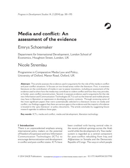 "This article assesses the evidence used to in arguments for the role of the media in conflict and post-conflict situations. It focuses on two broad areas within the literature. First, it examines literature on the contribution of media in war to peace transitions, including assessment of evidence used to show how the media may contribute to violent conflict and how they may provoke, or hinder, post-conflict reconstruction. Second, it assesses evidence used in arguments for the role new Information and Communication Technologies (ICTs) such as the Internet and mobile phones may have in liberation or oppression in developing country contexts. Through reviewing some of the most significant papers that were systematically selected in a literature review on media and conflict, our findings suggest that there are serious gaps in the evidence and the majority of evidence is located in the “grey literature” or policy documents. The article concludes by suggesting future research agendas to address these gaps." (Abstract)