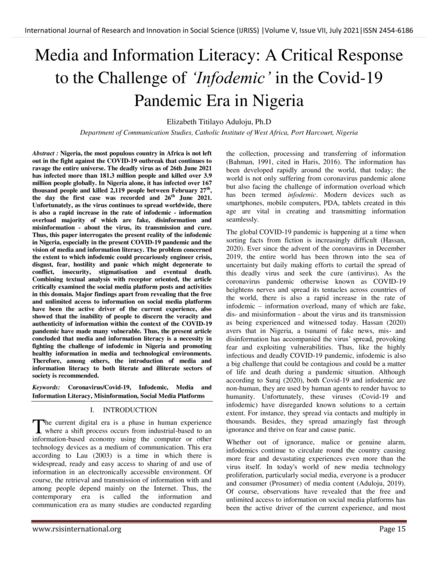 "Nigeria, the most populous country in Africa is not left out in the fight against the COVID-19 outbreak that continues to ravage the entire universe. The deadly virus as of 26th June 2021 has infected more than 181.3 million people and killed over 3.9 million people globally. In Nigeria alone, it has infected over 167 thousand people and killed 2,119 people between February 27th, the day the first case was recorded and 26th June 2021. Unfortunately, as the virus continues to spread worldwide, there is also a rapid increase in the rate of infodemic - information overload majority of which are fake, disinformation and misinformation - about the virus, its transmission and cure. Thus, this paper interrogates the present reality of the infodemic in Nigeria, especially in the present COVID-19 pandemic and the vision of media and information literacy. The problem concerned the extent to which infodemic could precariously engineer crisis, disgust, fear, hostility and panic which might degenerate to conflict, insecurity, stigmatisation and eventual death. Combining textual analysis with receptor oriented, the article critically examined the social media platform posts and activities in this domain. Major findings apart from revealing that the free and unlimited access to information on social media platforms have been the active driver of the current experience, also showed that the inability of people to discern the veracity and authenticity of information within the context of the COVID-19 pandemic have made many vulnerable. Thus, the present article concluded that media and information literacy is a necessity in fighting the challenge of infodemic in Nigeria and promoting healthy information in media and technological environments. Therefore, among others, the introduction of media and information literacy to both literate and illiterate sectors of society is recommended." (Abstract)