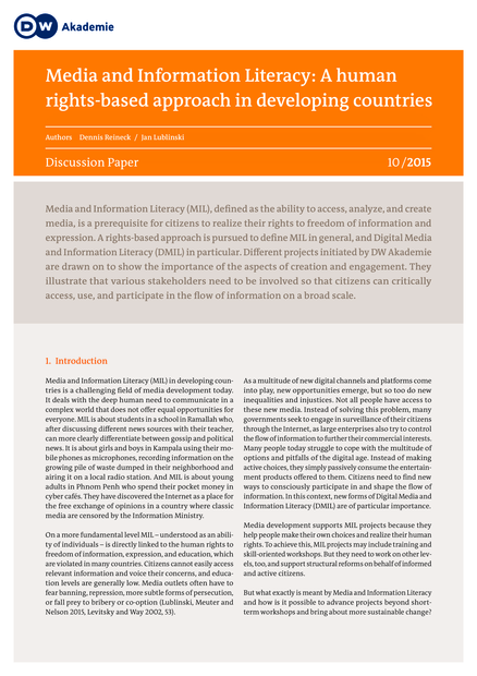 "Media and Information Literacy (MIL), defined as the ability to access, analyze, and create media, is a prerequisite for citizens to realize their rights to freedom of information and expression. A rights-based approach is pursued to define MIL in general, and Digital Media and Information Literacy (DMIL) in particular. Different projects initiated by DW Akademie are drawn on to show the importance of the aspects of creation and engagement. They illustrate that various stakeholders need to be involved so that citizens can critically access, use, and participate in the flow of information on a broad scale." (Page 1)