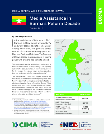 "Despite the grim outlook, media development efforts in Burma between 2010 and 2020 may be instructive not only for donors pondering the way forward, but also for media assistance efforts in other countries in transition. This report, part of the Center for International Media Assistance’s “Media Reform amid Political Upheaval” project, highlights the resiliency and impact of the extensive projects that media assistance actors and donors took in advance of Burma’s 2010 opening. It also serves as a case study in the dangers of supporting captured institutions, such as Burmese state media, when the entities that control those institutions are not committed to a democratic transition. In Burma’s case, the mainstream media reform agenda was guided by influential media development donors that supported government priorities to the detriment of independent journalists and grassroots activists who had an alternative vision for the country’s future. Finally, this briefing looks at two coalitions that undertook major reform campaigns during Burma’s opening, and draws on interviews from 42 people in the sector to outline principles that donors and media assistance organizations might use to navigate the post-coup environment." (Pages 2-3)