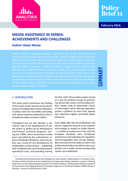 "While in 1990s media assistance efforts focused on ensuring the survival of independent media outlets under the authoritarian rule of the Miloševiæ regime, the scope of the assistance expanded after the regime collapsed in 2000, to address a range of issues, such as legal reforms, the establishment of regulatory bodies, the transformation of the state TV into a public service broadcaster, professionalization of journalism, and management of media outlets. However, in many ways the reforms still depend on continuous external support. Hence, this policy brief outlines key challenges to the media reforms, and lists several lessons that could inform the future media assistance efforts in Serbia." (Summary)