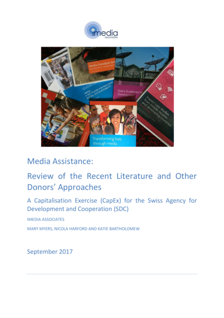 "The Swiss Agency for Development and Cooperation (SDC) has commissioned iMedia Associates (iMedia) to conduct a Capitalisation Exercise (CapEx) of its media assistance, with the primary objective of examining its current programmes and bringing out lessons learned. As the second output of this CapEx, iMedia has carried out a review of what other donors are doing on media assistance. As agreed, it focuses on current media support by five donors/agencies: DFID (UK Aid), Sida (Sweden), UNESCO, UNDP and the Knight Foundation. We have chosen the five donors to reflect the diversity of donor-types, namely two large and influential Western donors (UK’s DFID and Swedish Sida), agencies in the UN system (UNDP and UNESCO) and a well-endowed US-based private foundation (Knight Foundation). This review of other donors also synthesises key findings from a literature review of the wider media assistance sector in order to identify good practice and situate SDC’s approach in relation to other donors. Our emphasis is on current programmes, policy documents and funding mechanisms." (Introduction)