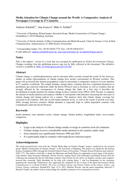"Climate change is a global phenomenon, and its outcomes affect societies around the world. So far, however, studies on media representations of climate change have mostly concentrated on Western societies. This paper goes beyond this limited geographical scope by presenting a comparative analysis of issue attention in 27 countries. The sample includes, among others, countries that have committed themselves to greenhouse gas emission reductions under the Kyoto Protocol such as Germany as well as countries that are strongly affected by the consequences of climate change like India. In a first step, it describes the development of media attention for climate change in these countries from 1996 to 2010. Second, it compares the amount of media attention and explores whether it corresponds with indicators measuring the relevance of climate change and climate policies for a country. The analyses show that climate change coverage has increased in all countries. Still, overall media attention levels, as well as the extent of growth over time, differ strongly between countries. Media attention is especially high in carbon dependent countries with commitments under the Kyoto Protocol." (Abstract)