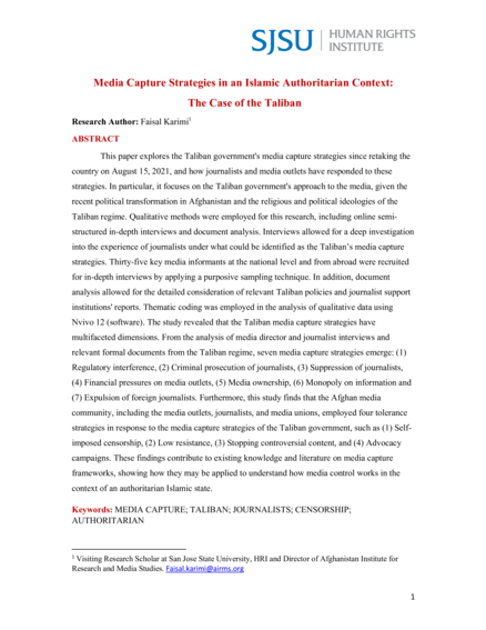 "This paper explores the Taliban government's media capture strategies since retaking the country on August 15, 2021, and how journalists and media outlets have responded to these strategies. In particular, it focuses on the Taliban government's approach to the media, given the recent political transformation in Afghanistan and the religious and political ideologies of the Taliban regime [...] The study revealed that the Taliban media capture strategies have multifaceted dimensions. From the analysis of media director and journalist interviews and relevant formal documents from the Taliban regime, seven media capture strategies emerge: (1) Regulatory interference, (2) Criminal prosecution of journalists, (3) Suppression of journalists, (4) Financial pressures on media outlets, (5) Media ownership, (6) Monopoly on information and (7) Expulsion of foreign journalists. Furthermore, this study finds that the Afghan media community, including the media outlets, journalists, and media unions, employed four tolerance strategies in response to the media capture strategies of the Taliban government, such as (1) Selfimposed censorship, (2) Low resistance, (3) Stopping controversial content, and (4) Advocacy campaigns." (Abstract)